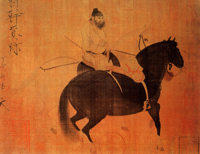 韩幹,中国唐代画家。京兆(今陕西西安)人 ,一作大梁(今河南开封)人。生卒年不详,约活跃于开元天宝间。曾任太府寺丞。擅人物、肖像、道释、花竹,尤精鞍马。初为酒店学徒,有绘画天才,得王维赏识与资助。作画初师曹霸,后自成一家,被召入宫廷,画马能以真马为师,比例准确,体形肥硕、健壮,态度安详,被杜甫称为“斡唯画肉不画骨”,具有盛唐风格。今有《照夜白图》、《牧马图》传世。前者画唐玄宗御马照夜马拴于柱上,昂首嘶鸣,前蹄腾骧;后者画一牧人骑马放牧二马,人物衣纹简练,神情生动,马匹形体准确,态度安适。