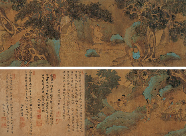 赵雍(1289—约1360),元代书画家。字仲穆,湖州(今属浙江)人。赵孟顺次子。以父荫入仕,官至集贤待制、同知湖州路总管府事。书画继承家学,赵孟顺尝为幻住庵写金刚经未半,雍足成之,其联续处人莫能辨。擅山水,尤精人物鞍马,亦作界画。书善正、行、草,亦长篆书。精鉴赏。传世作品有《兰竹图》、《溪山渔隐》等。