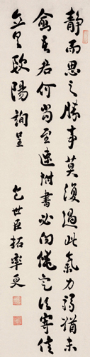 包世臣,1775年生,1855年逝世,安徽泾县人。清代学者、书法家、书学理论家。字慎伯,晚号倦翁、小倦游阁外史。泾县古名安吴,世称“包安吴”。嘉庆二十年举人,曾官江西新渝知县,被劾去官。少工词章。喜兵家言,治经济学。工书法,肆力北魏、兼学“二王”,备得古人神韵。他不但是位书法家,而是一位在书法史上有巨大影响的书法理论家。何绍基称其书名重于江南。著有《安吴四种》,其中《艺舟双楫》下篇为书法理论,提倡北碑,主张转指,对清代中、后期书风的变革影响很大。传世书迹较多。《临书谱》轴,纸本墨迹。草书。凡5行,共57字。纵144.6厘米,横74厘米。天津艺术博物馆藏。包世臣学识渊博,对农政、货币以及文学等均有研究。他为扭转宋代以后帖学的流弊,先后与阮元、康有为同倡碑学,最后致力于篆、隶北碑。一般用笔以侧取势是他书法的主要特点。此碑作品亦不例外。孙过庭《书谱》甚有右军法,包氏临之,大概也属学习“二王”的一种辅助练习吧。通篇点画饱满,但多不能横平竖直,行笔虽纵逸互用,环转连属却不强调,运笔速度较慢,多为一字一停。结体左低右高,横、竖常呈侧斜之势;行距紧凑,作品整体感强,并由于笔画不同侧面的对应使作品得以气势贯通,不觉板滞。由于他用笔过于讲究,放缓速度,随意性也就减弱,造成线条有的地方不够自然,有作做之嫌。
