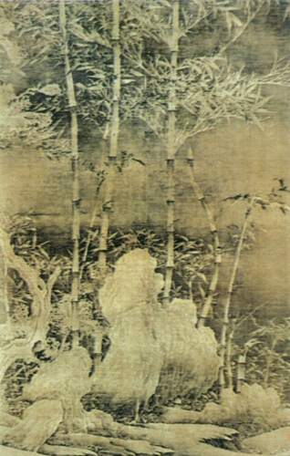 徐熙,五代南唐画家。江苏南京人,他是一般的老百姓,为人宁静淡泊,专心绘画。擅长画江湖间汀花、野竹、水鸟、鱼虫、蔬果。他经常游山林园圃,细察动植物情状。他与后蜀黄筌的花鸟画为五代两大流派,两派的风格不同,各有不同。他所画花木禽鸟,形骨轻秀。独创“落墨”法,用粗笔浓墨,草草写枝叶萼蕊,略施杂彩,使色不碍墨,不掩笔迹。一变黄筌细笔勾勒,填彩晕染的方法。然当时黄筌在画院占优势,掩斥徐熙不能入画院。直至后来徐才出名。米芾说:“黄筌画不足收,易摹;徐熙画不可摹。”推崇备至。《宣和画谱》中辑入徐的作品有249件,《鹤竹图》辑入《德隅斋画品》,但传世真迹甚少。另有《雪竹图》,有谓风貌与徐熙类似,现藏上海博物馆。